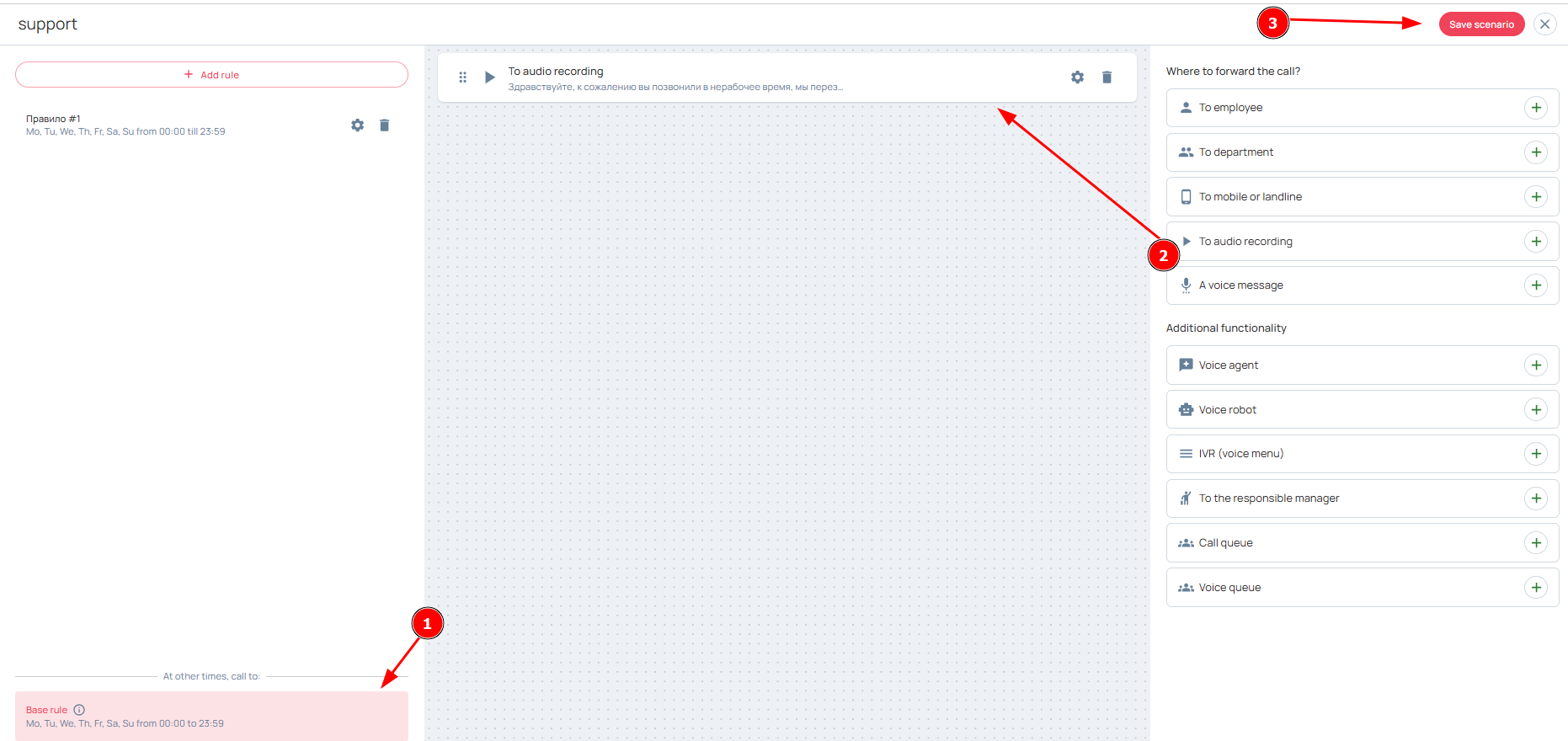 Relevant if the schedule is NOT 24/7. In the base rule, we specify the action that will need to be performed during the rest of the time, except for the one specified in the “Working hours” rule. For example, enabling an entry from the UniTalk library – “Hello, unfortunately, you called after hours, we will call you back at the beginning of the working day. Thanks for reaching out.”