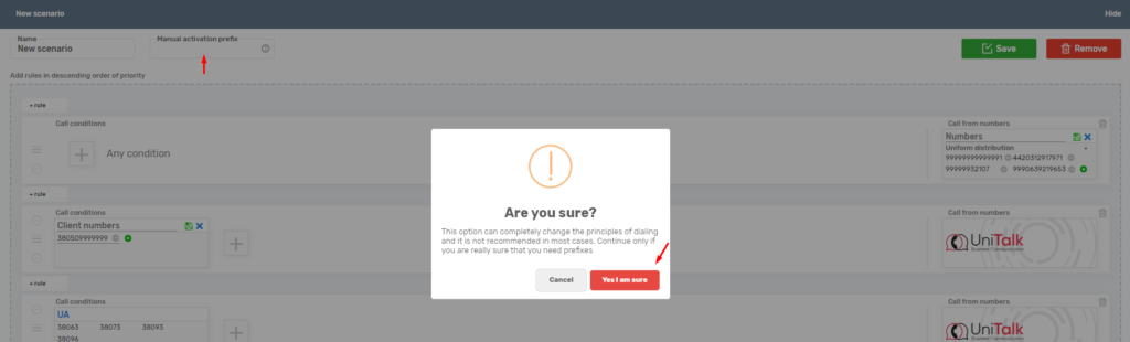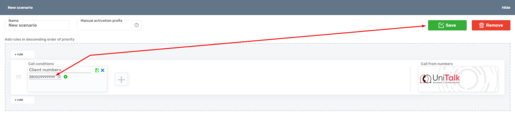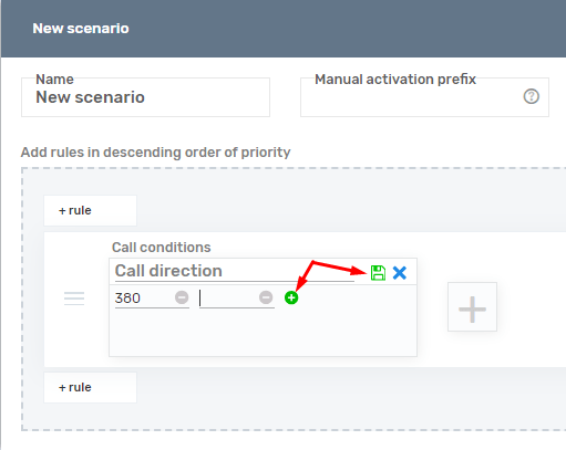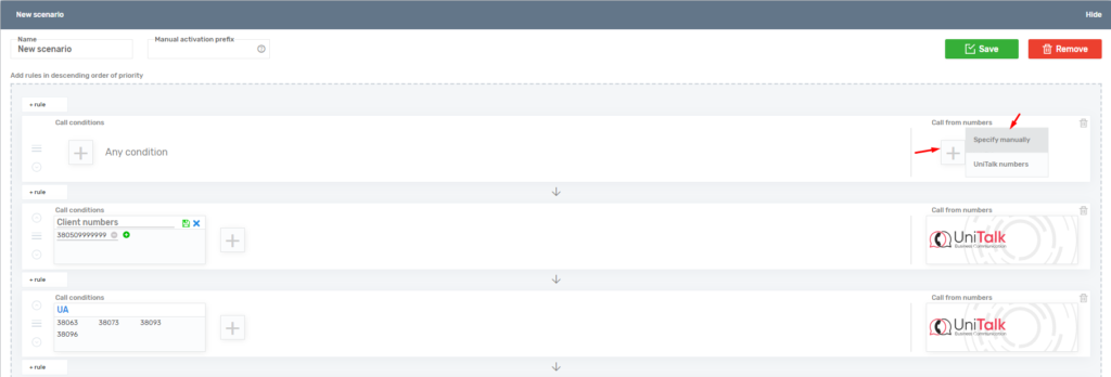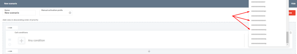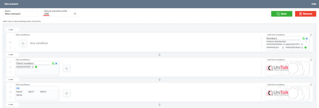 Also in outgoing scripts it is possible to specify a prefix for manual call activation. This service allows you to call from a specific scenario, ignoring the active scenario, by specifying a digital prefix (from three digits, for example, 545 + customer number).