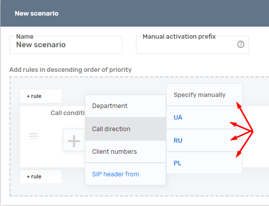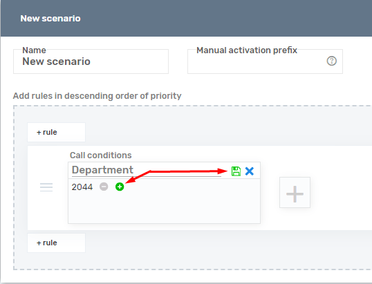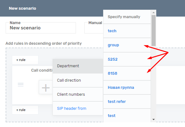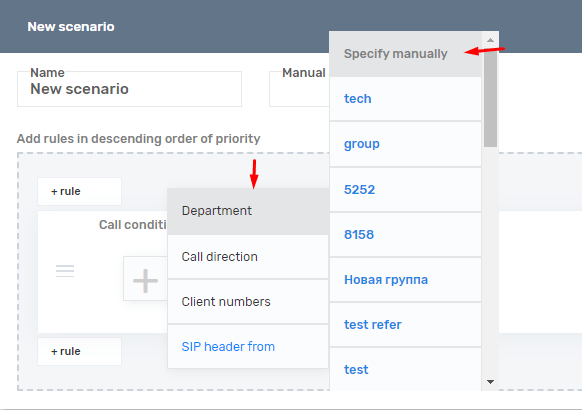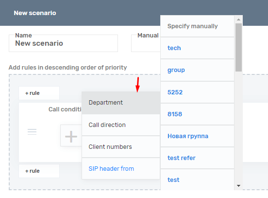 To do this, you need to click on “+ rule” and select a department, where in the drop-down list you can select one of the previously created departments and specify it as the conditions for the call.