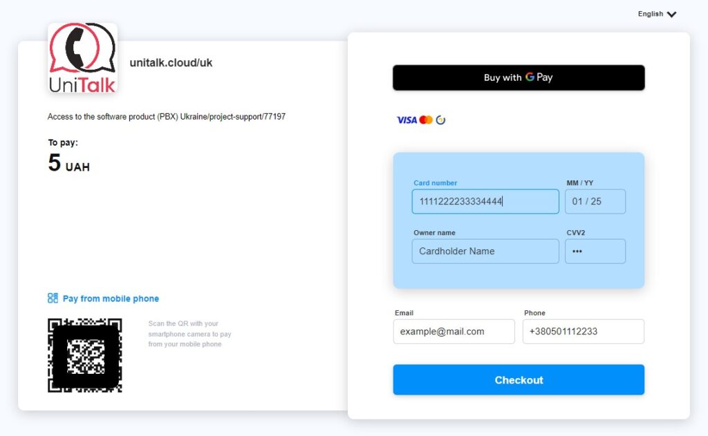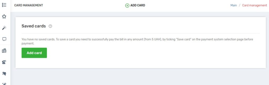 3. Click on the “Add card” button, by doing so you create an account for 5 UAH. The money will be credited to your balance and you can spend it on UniTalk services or telecom operators.