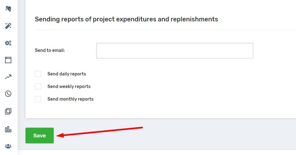 - Enable the settings: “Charge card when low balance is reached” and ‘Charge card if there are not enough funds to pay the subscription fee’. Fill in the fields for the minimum balance and the amount to be charged from the card.