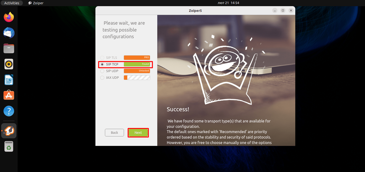 The next step is to test the ability to connect via different protocols, in our case SIP UDP is required, it should be highlighted in the checkbox and have the status (Found), if everything is fine at this stage, click Next, if not, go back to the beginning and check the correctness of the login and password, perhaps a space was added somewhere.