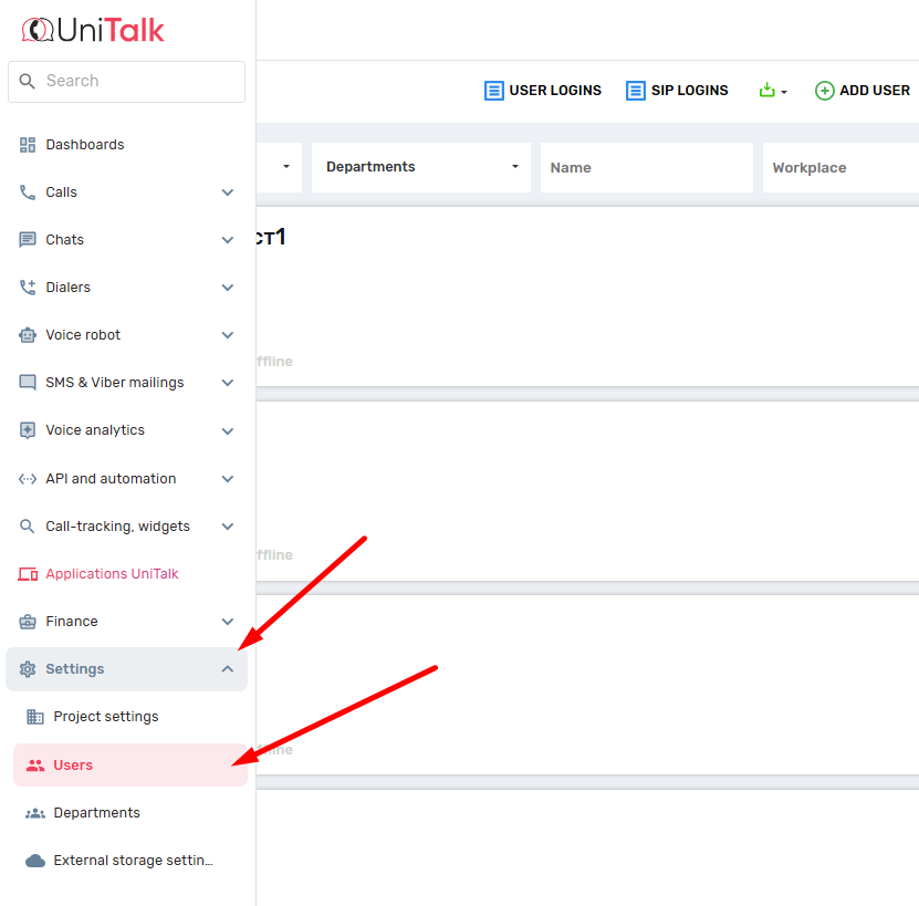 To continue, you will need a login and password for the internal line, this information can be obtained in the UniTalk’s personal account user in the “Users” tab in the “Settings” section.