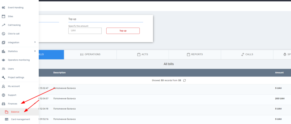 To start or continue using UniTalk services, you need to top up your balance. You can do this by logging into your UniTalk personal account in the “Finance” → “Balance” section: