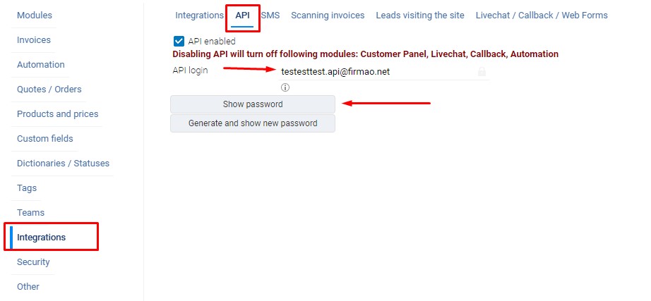 Credentials are provided in the Firmao dashboard in the “Company Settings / Integrations” section under “API”: