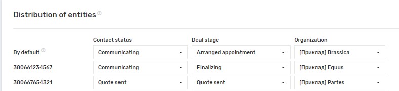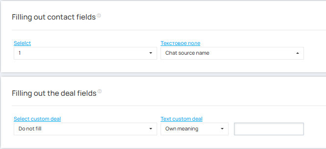 Similarly to call settings, you can distribute deals by funnels and select the status with which the deal will be created.