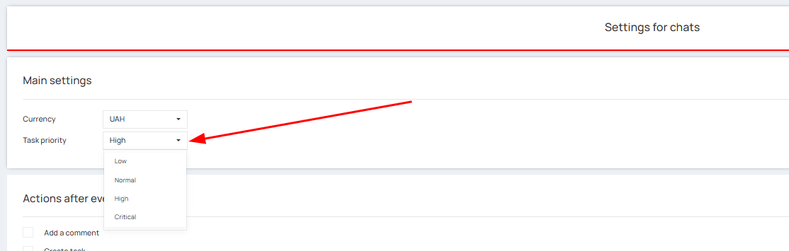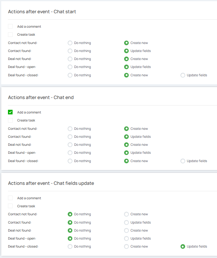 In each of these cases, you can configure whether to create comments, tasks on the selected board with the ability to specify the status, as well as determine actions with contacts and deals.