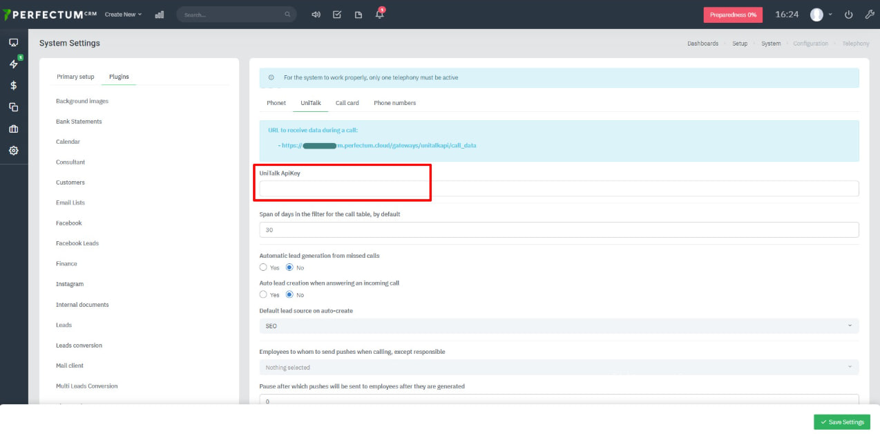 To configure the integration of CRM Perfectum with UniTalk IP telephony, go to Settings – Settings → Configuration → Telephony → UniTalk.