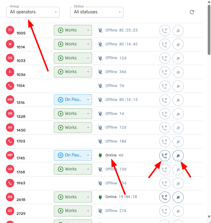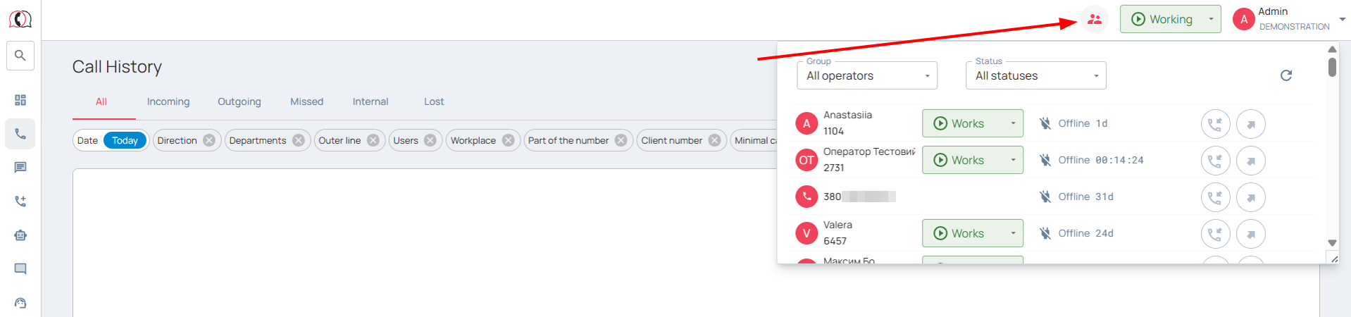 Thanks to the built-in filter, you can display information about all employees or the department (division) you are interested in. The name of the operator displays the internal phone number, their first and last name (if this information is entered in the project settings).