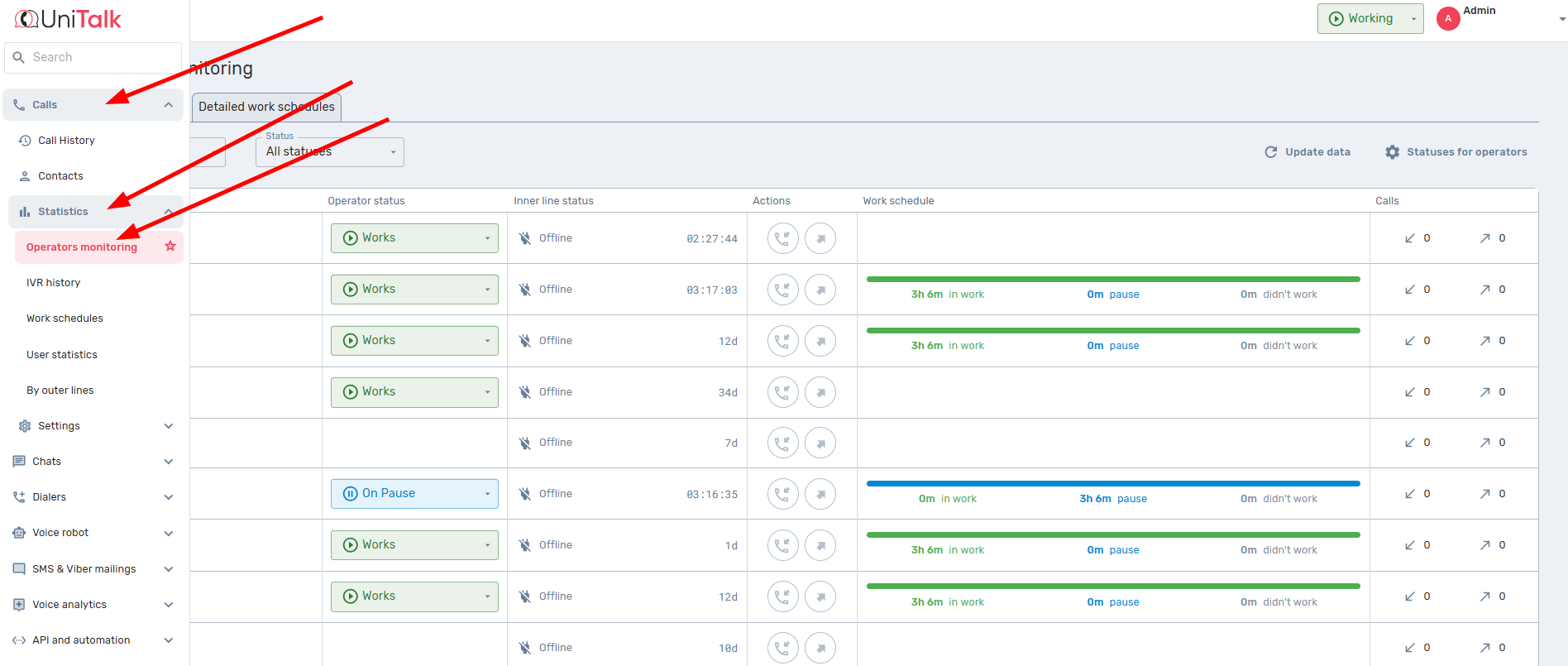 For more detailed monitoring of your company’s employees, the UniTalk team has developed additional operator monitoring functionality. It is an ideal tool for business owners or managers, allowing them to observe or change the status of internal lines and the status of each operator individually in real time, as well as analyze the number of incoming and outgoing calls.