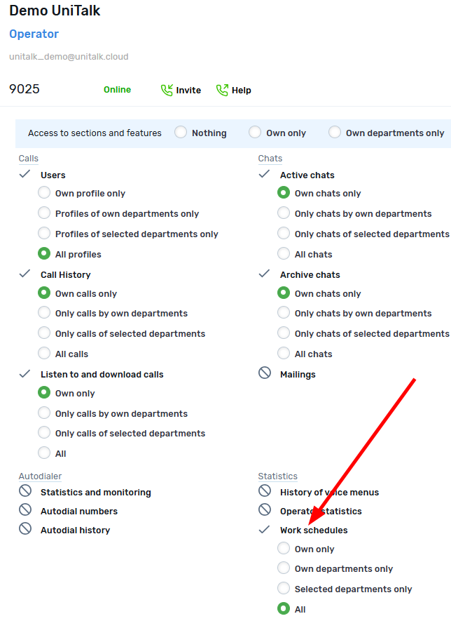Access for employees to the quick access panel and to the “Operator Monitoring” page itself is controlled by the “Work schedules” checkbox on the “Users” page.