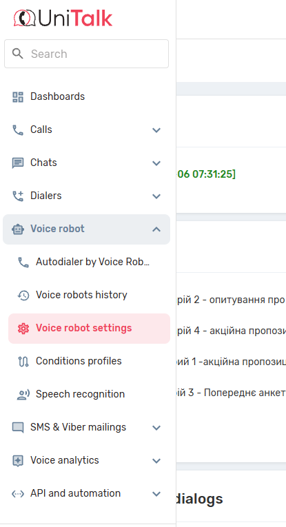 “Voice robot settings” are located in the UniTalk personal account in the “Voice robot” tab: