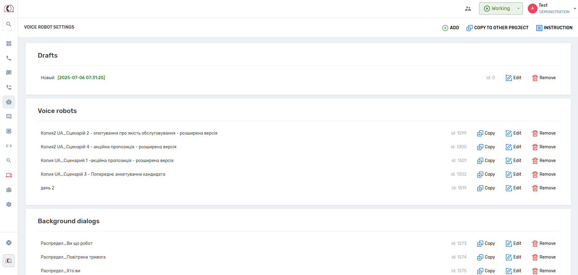 Creating an effective Voice Bot starts with an intuitive interface. The “Voice Bot Settings” page in UniTalk is your command center, where you can centrally manage all dialogue automation. Here, you not only create new bots but also control all drafts, copy successful models to other projects, and quickly obtain technical IDs for API integrations. The benefit for you? You gain complete control over automation and save time on routine processes.
