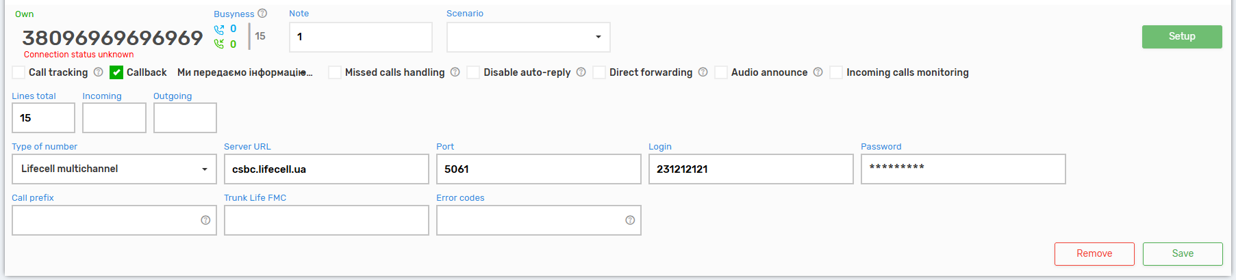 This is how the parameters of the number with the connection type “by login and password” look like: