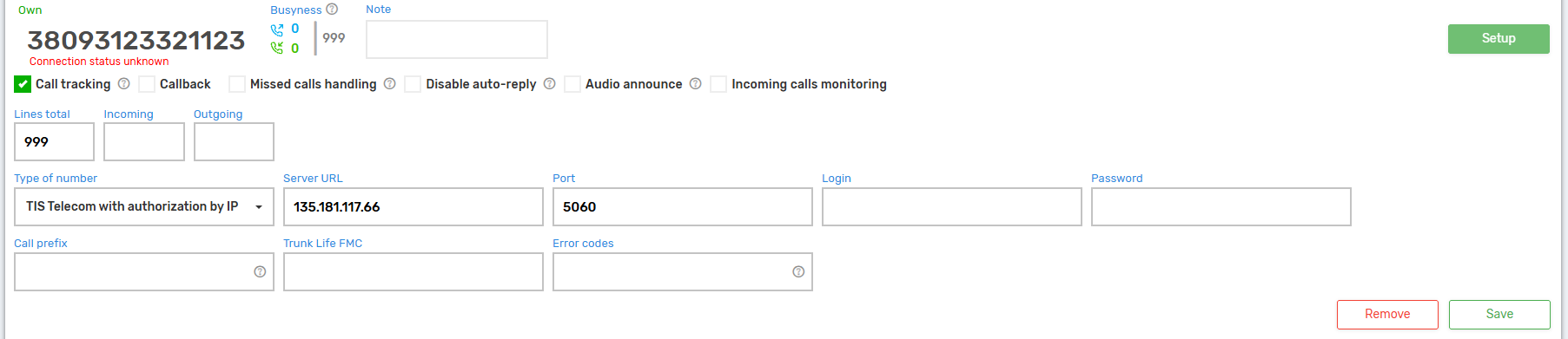 Numbers with the “via IP” connection type, in addition to the absence of a login and password, have the peculiarity that their status is always displayed as “Connection status unknown”, and not Online, like the numbers with the “login password” connection type.