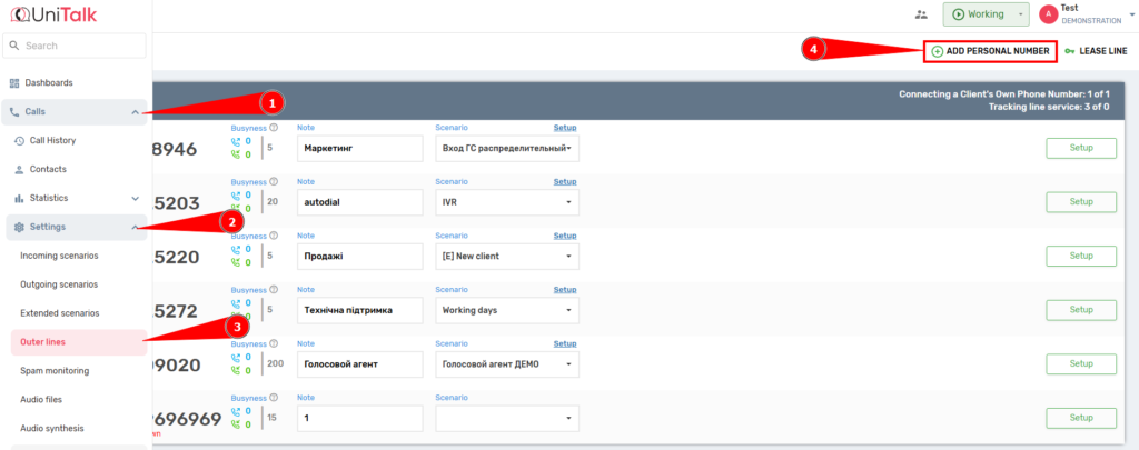 - submit this data to UniTalk support. You can also connect the number yourself through your UniTalk personal account in the Calls – Settings – External lines section by clicking the Add personal number button.