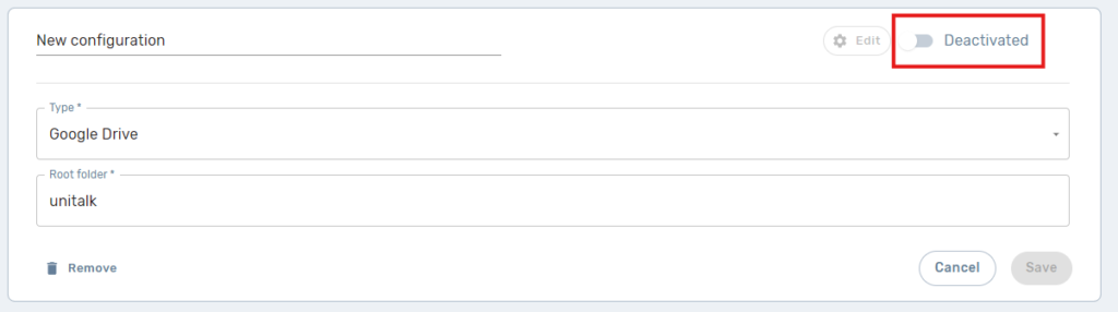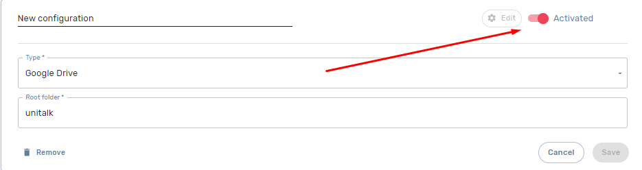 After successful authorization, we are returned to the page with the configuration of external storage in the personal account. It is also possible to activate the created configuration: