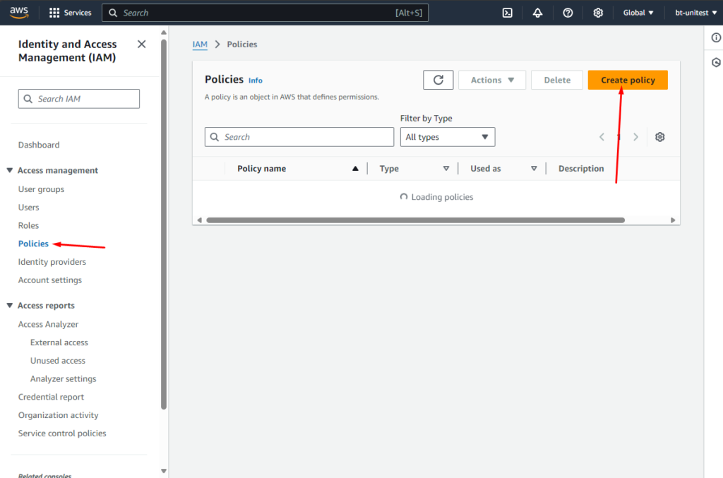 – Go to Identity and Access Management (IAM) -> Policies, and create a new policy
