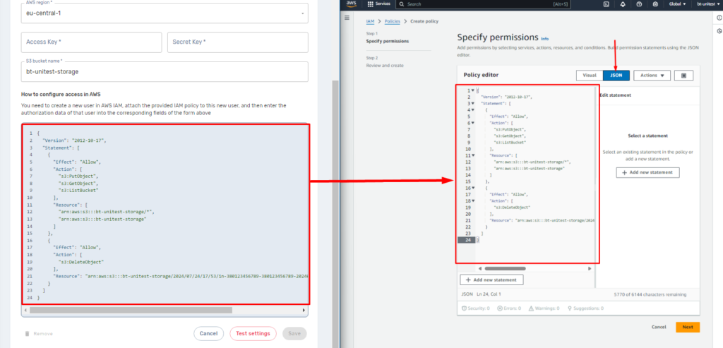 – We copy the template with the necessary access rights from the Unitalk personal account. We choose the method of setting JSON access rights and move on to the policy settings