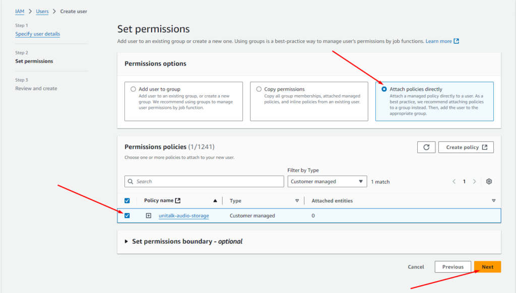 Assign the AWS service access policy we created to the user. Select the assignment method “Attach policies directly” and find the created access policy by name (it’s easy to find by filtering all access policy templates by the “Customer managed” type). Let’s move on to the user settings and confirm its creation