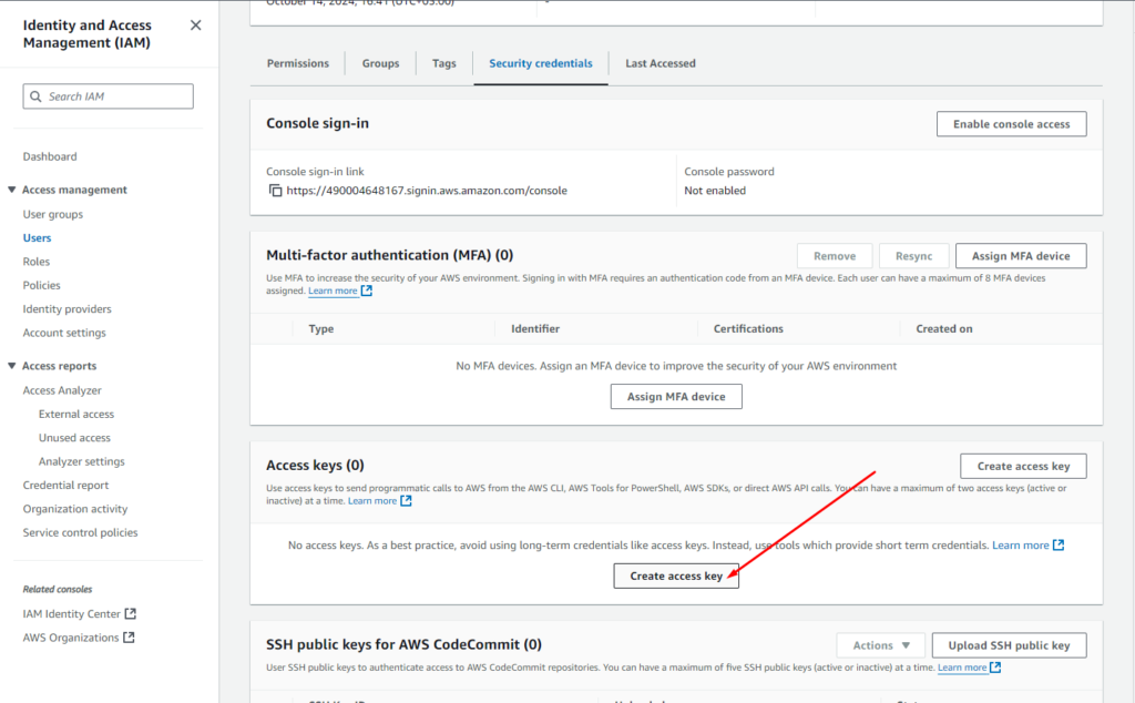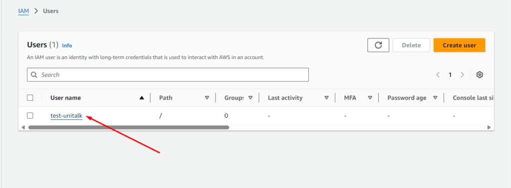To get the access keys that need to be specified in the Unitalk personal account, go to the Identity and Access Management (IAM) -> Users section and go to the settings of the user we just created