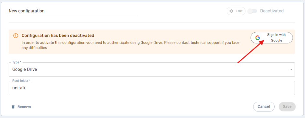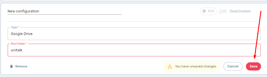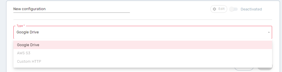 2. Specify the name of the configuration, and select Google Drive in the Type field: