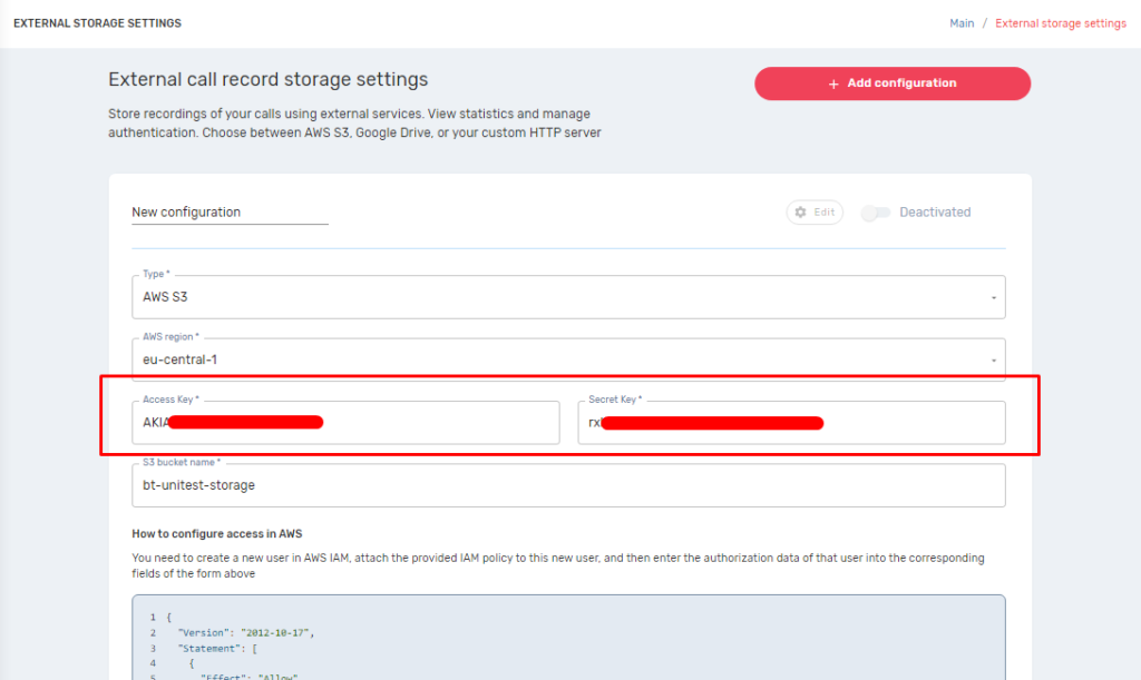 – Be sure to copy the Access key and Secret access key, because it is they that must be specified in the configuration settings of the external storage in Unitalk. Click “Done”.