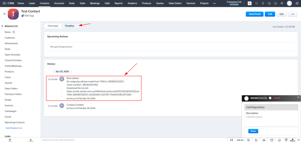 14. After the conversation is finished, a comment with a link to the conversation recording will be added to the contact card.