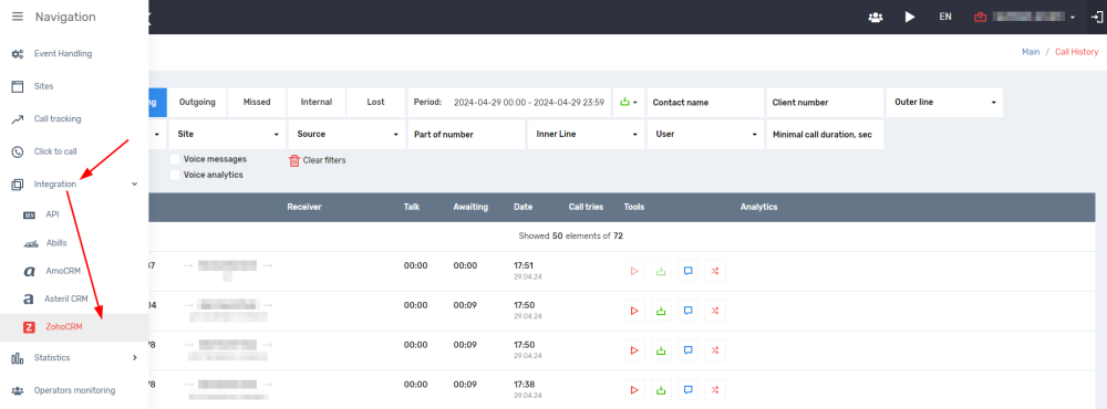 13. Integration setup is complete. To check, you can make several test calls and check if everything works correctly.
