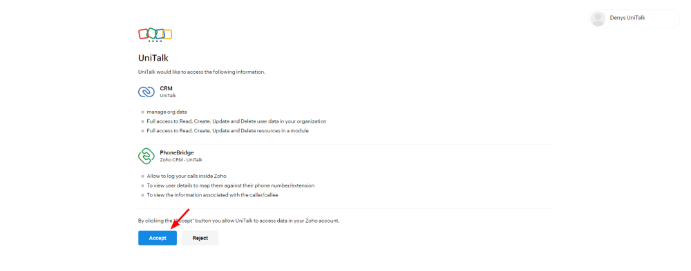 Note. Before performing the steps according to the step-by-step instruction, you must be logged in to UniTalk and ZohoCRM personal accounts with administrator rights.