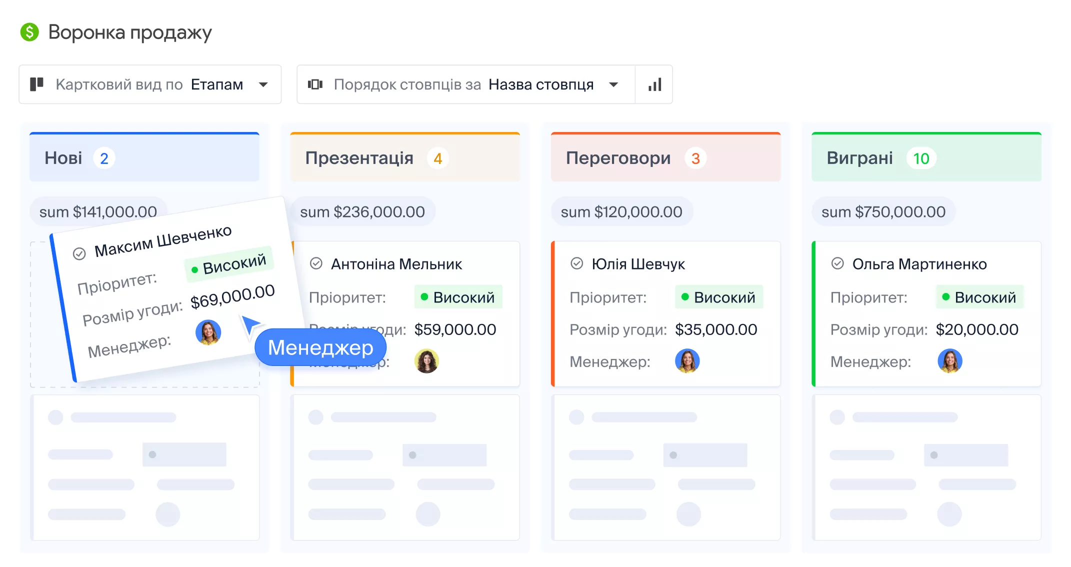 Украиноязычный интерфейс доступен в NetHunt, KeyCRM, SalesDrive, Keepin CRM, Keruj, Perfectum, SendPulse CRM, OneBox, Creatio и RemOnline. С ними бизнесу не придется адаптировать команду англоязычному интерфейсу.