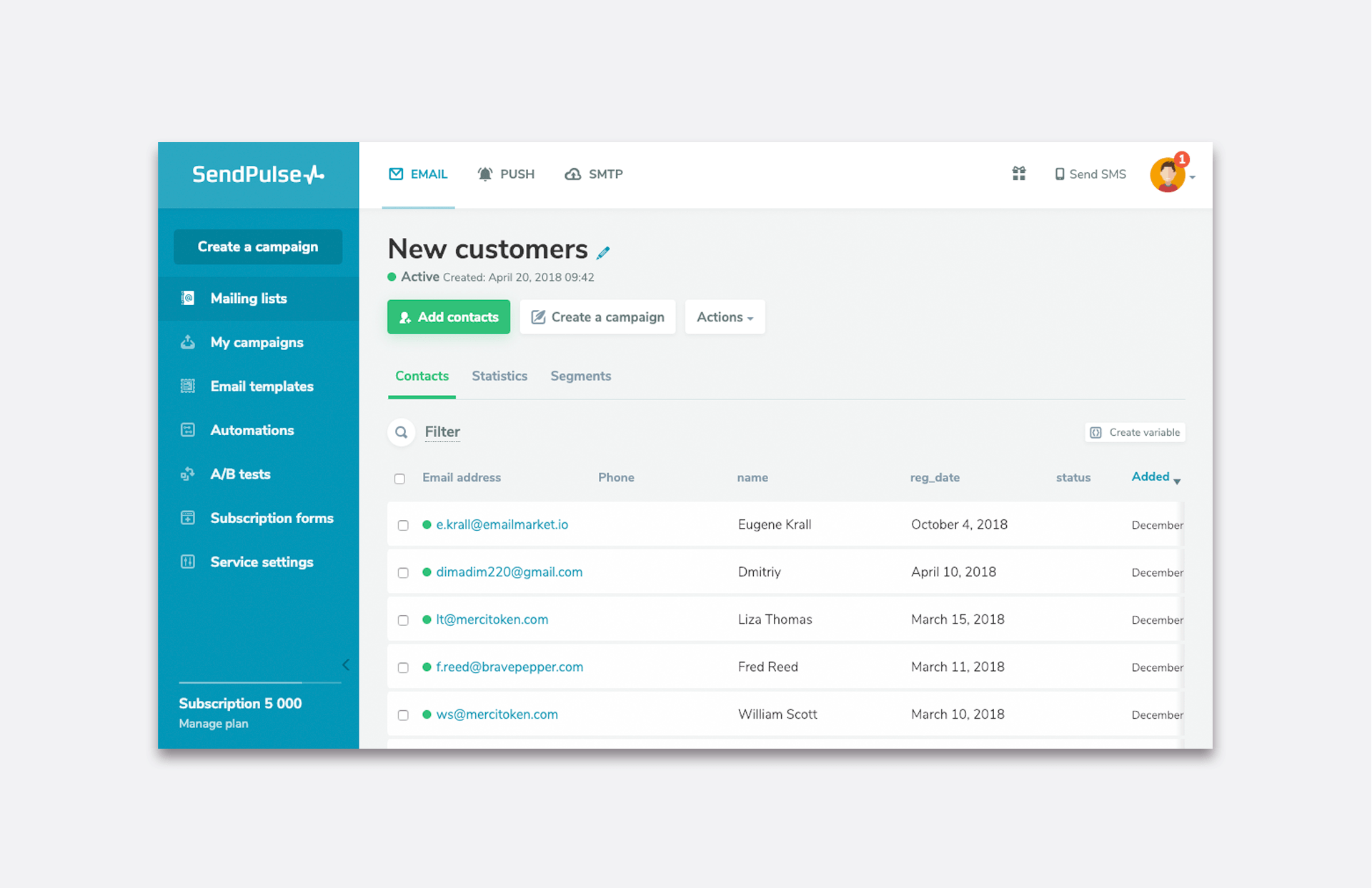 SendPulse — маркетинговая платформа с акцентом на работу с клиентской базой, сегментацией и автоматическими коммуникациями. Если в Битрикс24 требовалось настраивать рассылки через сторонние платные сервисы, здесь это входит в базовую экосистему. Для внедрения и интеграции SendPulse с телефонией и другими сервисами не требуется интегратор, а интерфейс системы интуитивно понятный.