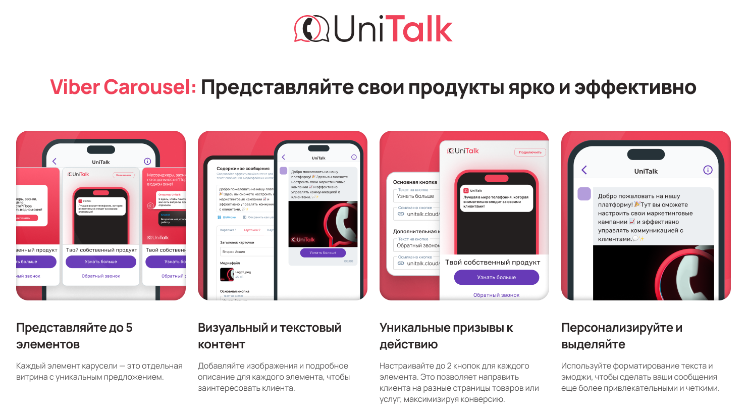 Viber-рассылки позволяют отправлять сообщения до 1000 символов, добавлять изображения и кнопки с призывом к действию, делая коммуникацию заметнее и эффективнее. Дополнительно можно использовать Viber-карусели — формат, который превращает рассылку в мини-витрину с несколькими товарами, которые пользователь может листать прямо в мессенджере.