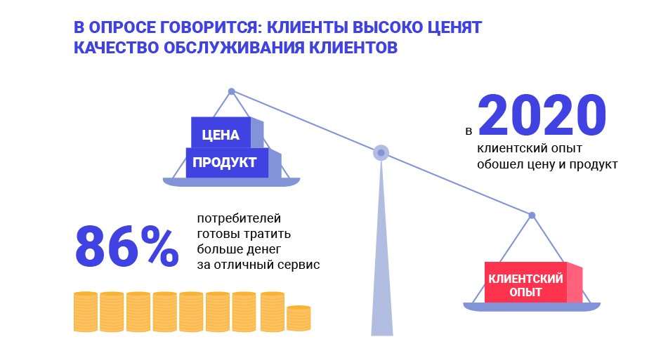 Согласно опросам, 86 % потребителей уже сейчас готовы тратить больше денег за отличный сервис. В 2020 году клиентский опыт обошел цену и продукт и стал главным приоритетом при выборе потребителя.