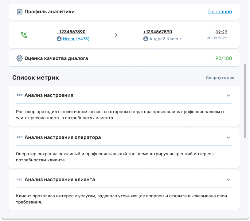 Речевая аналитика решает эту проблему, автоматически обрабатывая все нужные (например, только входящие или только длинные) разговоры, транскрибируя их в текст и анализируя по заданным параметрам. Это позволяет охватить 100% важных звонков без необходимости привлечения дополнительного персонала.