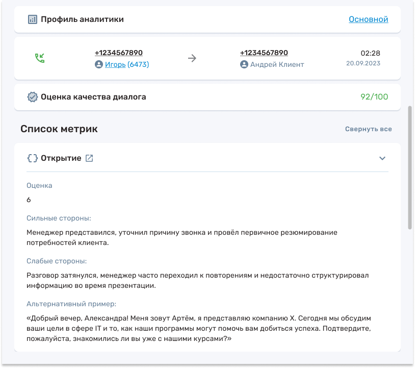 - Качество работы команды. Анализ разговоров позволяет оценить, насколько хорошо менеджеры придерживаются скриптов, правильно ли они реагируют на возражения, предлагают ли соответствующие решения. Речевую аналитику можно настроить так, чтобы проводить оценку различных этапов диалога (например, открытие или завершение) отдельно, по разным критериям оценки и параметрам. Ниже пример того, как может выглядеть оценка «открытия» с указанными сильными и слабыми сторонами оператора, рекомендациями по улучшению и реакцией клиента: