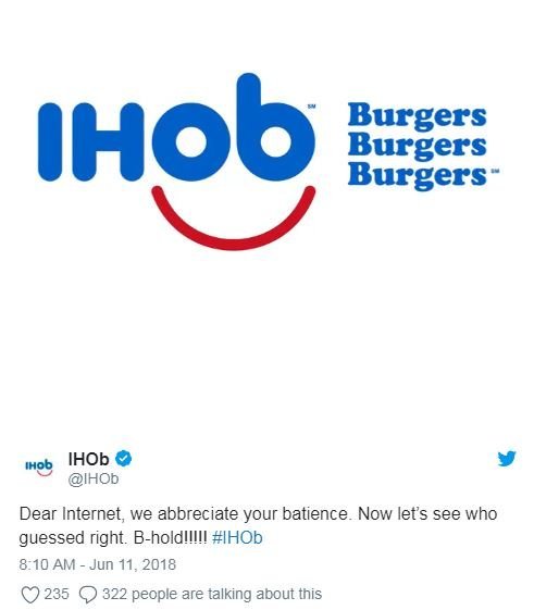 В 2018 IHOP вызвал настоящий ажиотаж в сети, предложив изменить свое название с IHOP на IHOb. Но никто не знал, что означает буква «b». В течение следующих 7 дней весь мир гадал, что это может означать. Они подогревали интригу в соцсетях и наконец раскрыли скрытый смысл: b означает гамбургеры.