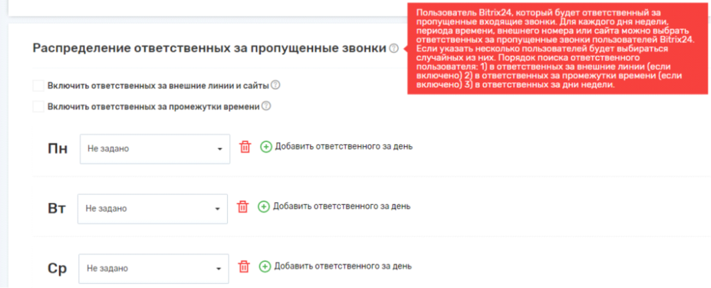 Для пропущенных звонков можно выбирать ответственных сотрудников в зависимости от источника звонка, дня недели и промежутка времени. Можно выбирать случайного ответственного из группы сотрудников.