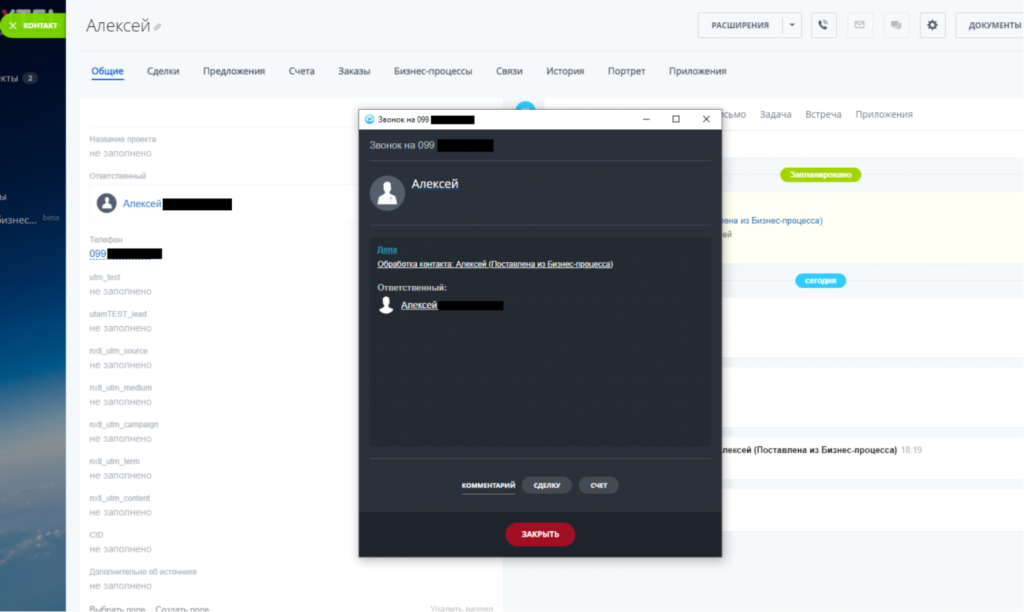 В зависимости от настроек интеграции при входящих звонках в Bitrix24 будет создаваться карточка лида или же контакта и сделки. При этом автоматически заполняется имя клиента, его номер телефона и ответственный сотрудник. При создании карточки ответственным устанавливается сотрудник, который ответил на звонок.