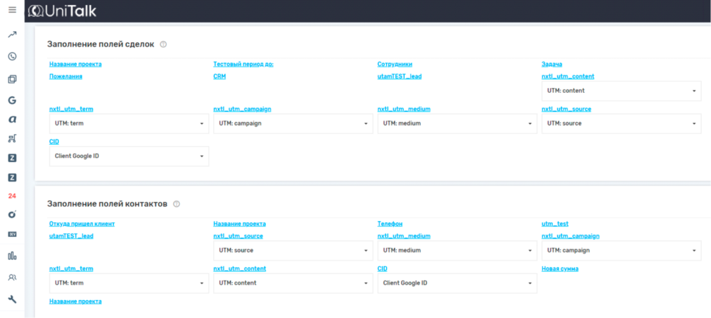 Если поступает Call Tracking или звонок с Кнопки обратного звонка, то в карточки лида, контакта и сделки при создании могут передаваться данные конверсии: utm-метки (utm_source, utm_medium, utm_campaign, utm_term, utm_content), Client Google ID, номер визита RoiStat, номер, на который позвонил клиент или своё значение.