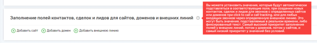 Также возможны вариации передаваемых данных в зависимости от источника звонка. Поля контактов, сделок или лидов заполняются в порядке приоритета в зависимости от внешней линии, на который поступил звонок, в зависимости от домена сайта, с которого был звонок. Самый низкий приоритет у значений без условий.