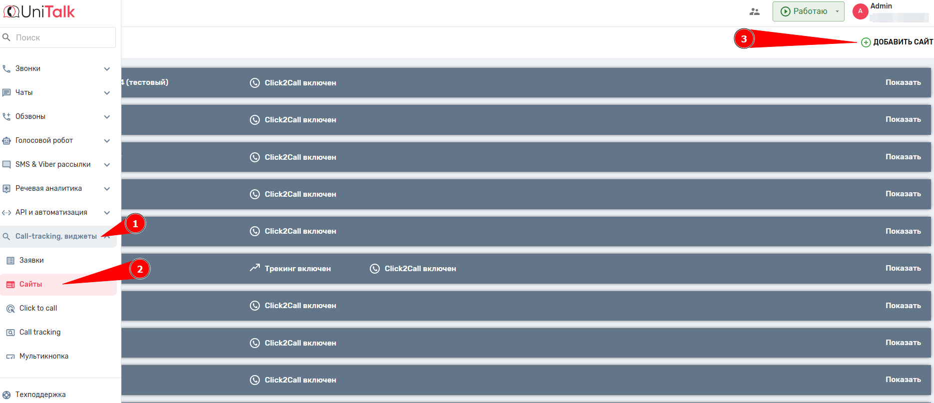 1. Перейдите в раздел Call-tracking, виджеты — Сайты кабинета UniTalk и нажмите «Добавить сайт».