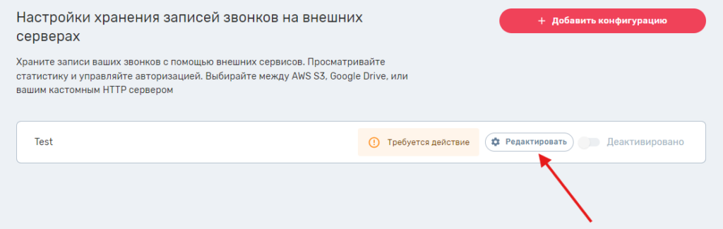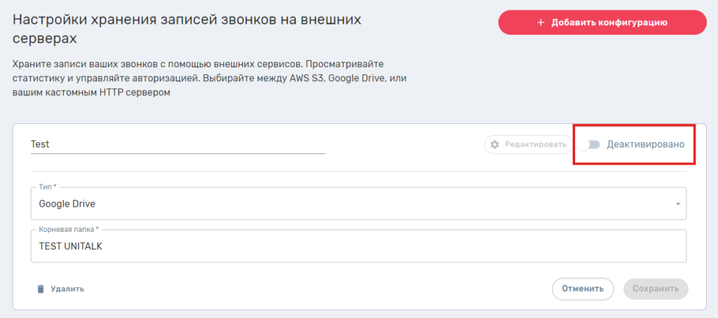 Записи звонков первоначально загружаются на наш сервер, а затем, по мере необходимости, переносятся на внешнее хранилище. Если конфигурация активна, все старые звонки проекта постепенно переносятся на выбранный при авторизации Google Drive. Новые звонки будут переноситься сразу после завершения.