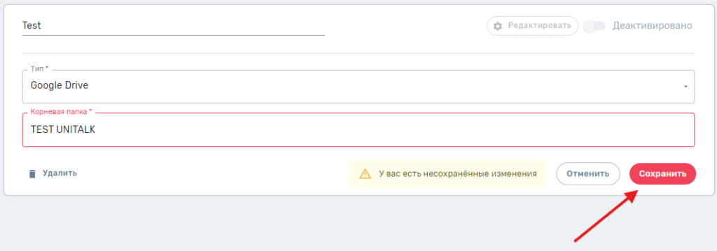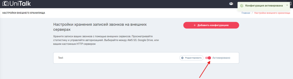 После успешной авторизации нас возвращает обратно на страницу с настройками внешнего хранилища в личном кабинете. Также появляется возможность активировать созданную конфигурацию: