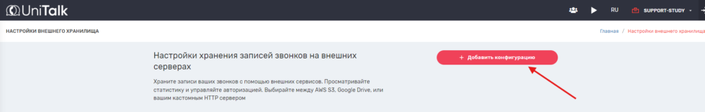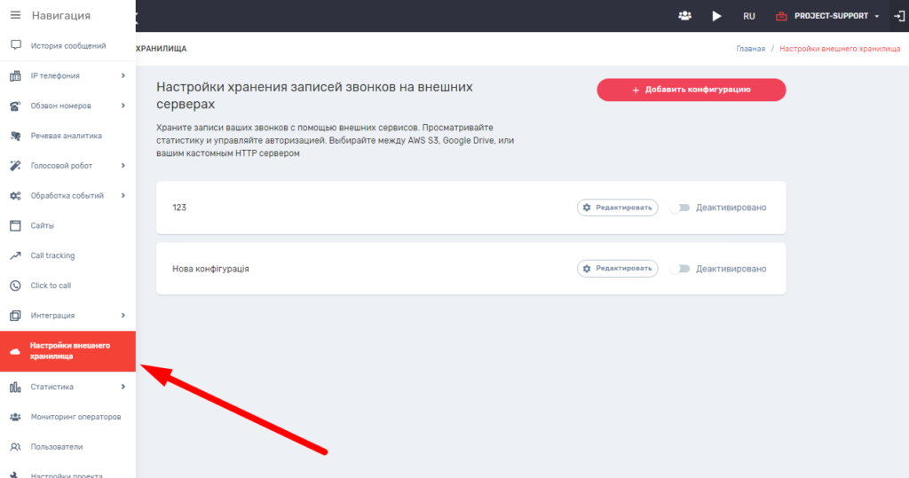 Конфигурацию для интеграции с внешним хранилищем можно создать только при наличии соответствующей услуги в тарифе проекта. Данная услуга доступна в тарифе Corporation.