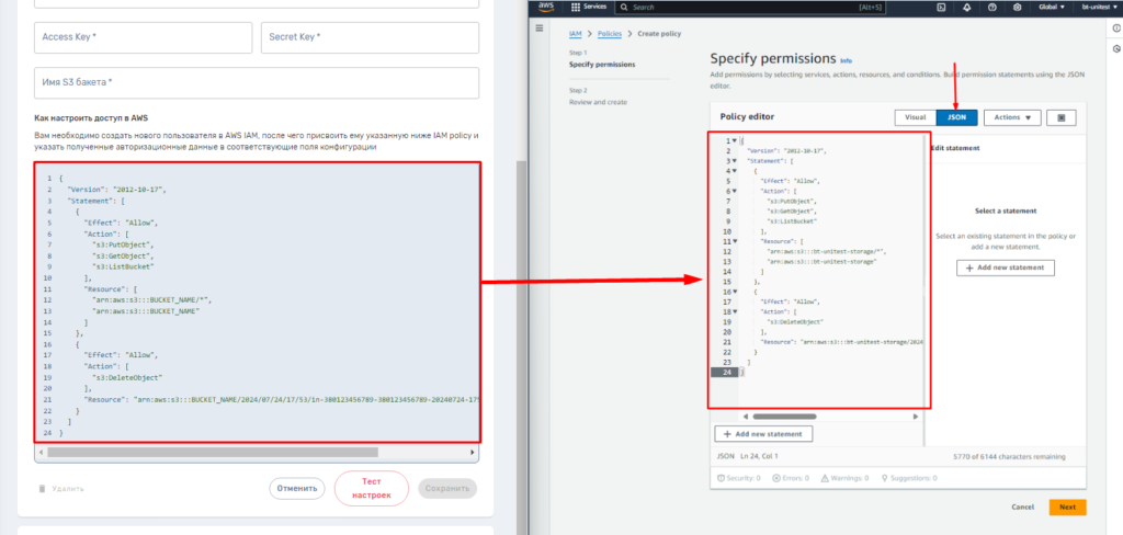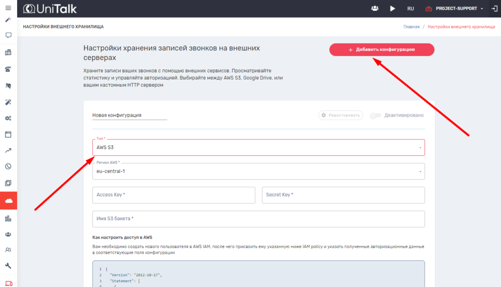 Создание политики доступа, необходимой для загрузки аудио с Unitalk в S3