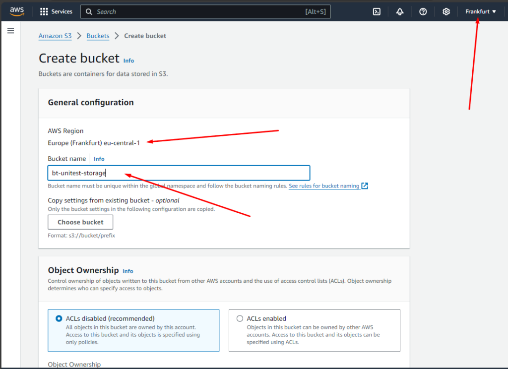 – Выбираем необходимый регион, в котором будет создан бакет