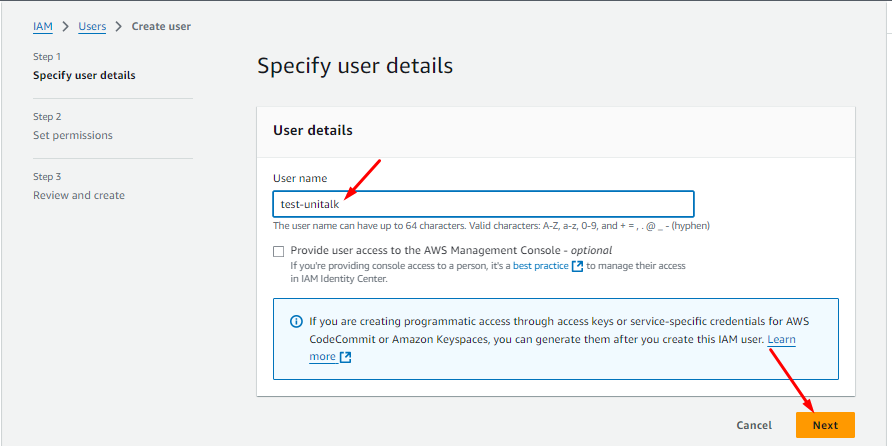 Чтобы получить ключи доступа, которые нужно указать в личном кабинете Unitalk, переходим в раздел Identity and Access Management (IAM) -> Users и переходим к настройкам только что созданного нами пользователя