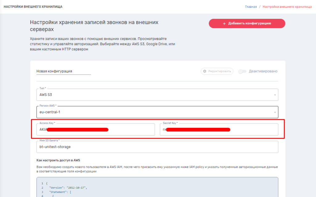 Настройка внешнего хранилища для аудиозаписей в AWS s3