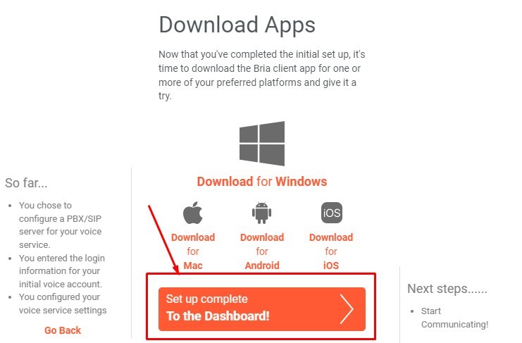 4. Готово! Вы создали аккаунт в «BRIA SOLO» и настроили SIP линию. Для подтверждения вышеуказанных настроек нажмите на кнопку «SET UP COMPLETE».